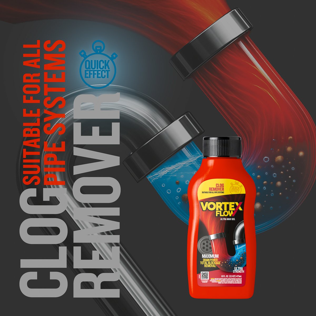 Vortex Flow Clog Remover delivers powerful performance to dissolve stubborn blockages and restore free-flowing drains. Its balanced formula penetrates deep into the clog to break down hair, grease, and soap scum effectively without damaging pipes.